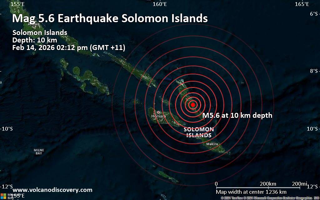 A shallow magnitude 5.6 earthquake was reported early afternoon near Honiara, Solomon Islands. According to Indonesia's Meteorology, Climatology, and Geophysical Agency, the quake hit on Saturday, February 14th, 2026, at 2:12 pm local time at a shallow depth of 10. km. Shallow earthquakes are felt more strongly than deeper ones as they are closer to the surface. The exact magnitude, epicenter, and depth of the quake might be revised within the next few hours or minutes as seismologists review data and refine their calculations, or as other agencies issue their report. Our monitoring service identified a second report from the German Research Centre for Geosciences (GFZ) which listed the quake at magnitude 4.9. A third agency, the citizen-seismograph network of RaspberryShake, reported the same quake at magnitude 5.0. Based on the preliminary seismic data, the quake was probably felt by many people in the area of the epicenter. It should not have caused significant damage, other than objects falling from shelves, broken windows, etc. In Auki (pop. 7,000) located 68 km from the epicenter, the quake should have been felt as light shaking. Weak shaking might have been felt in Tulagi (pop. 1,800) located 111 km from the epicenter, Malango (pop. 15,600) 125 km away, Honiara (pop. 56,300) 136 km away, and Tandai (pop. 24,600) 137 km away. VolcanoDiscovery will automatically update magnitude and depth if these change and follow up if other significant news about the quake become available. If you’re in the area, please send us your experience through our reporting mechanism, either online or via our mobile app. This will help us provide more first-hand updates to anyone around the globe who wants to know more about this quake.