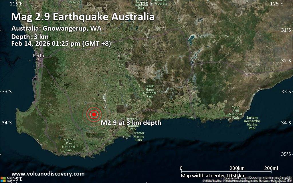 Just 11 minutes ago, a 2.9-magnitude earthquake struck near Katanning, Western Australia, Australia. The tremor was recorded around noon on Saturday, February 14th, 2026, at 1:25 pm local time, at a very shallow depth of 1.7 miles below the surface. The event was filed by Geoscience Australia (GeoAu), the first seismological agency to report it. A second report was later issued by the European-Mediterranean Seismological Centre (EMSC), which listed it as a magnitude 2.9 earthquake as well. Towns or cities near the epicenter where the quake might have been felt as very weak shaking include Badjebup (pop. 38) located 9 miles from the epicenter, Coyrecup (pop. 42) 10 miles away, Pallinup (pop. 78) 12 miles away, and Gnowangerup (pop. 590) 14 miles away. In Nyabing (pop. 290, 17 miles away), Broomehill (pop. 380, 21 miles away), and Katanning (pop. 3,700, 25 miles away), the quake was probably not felt.